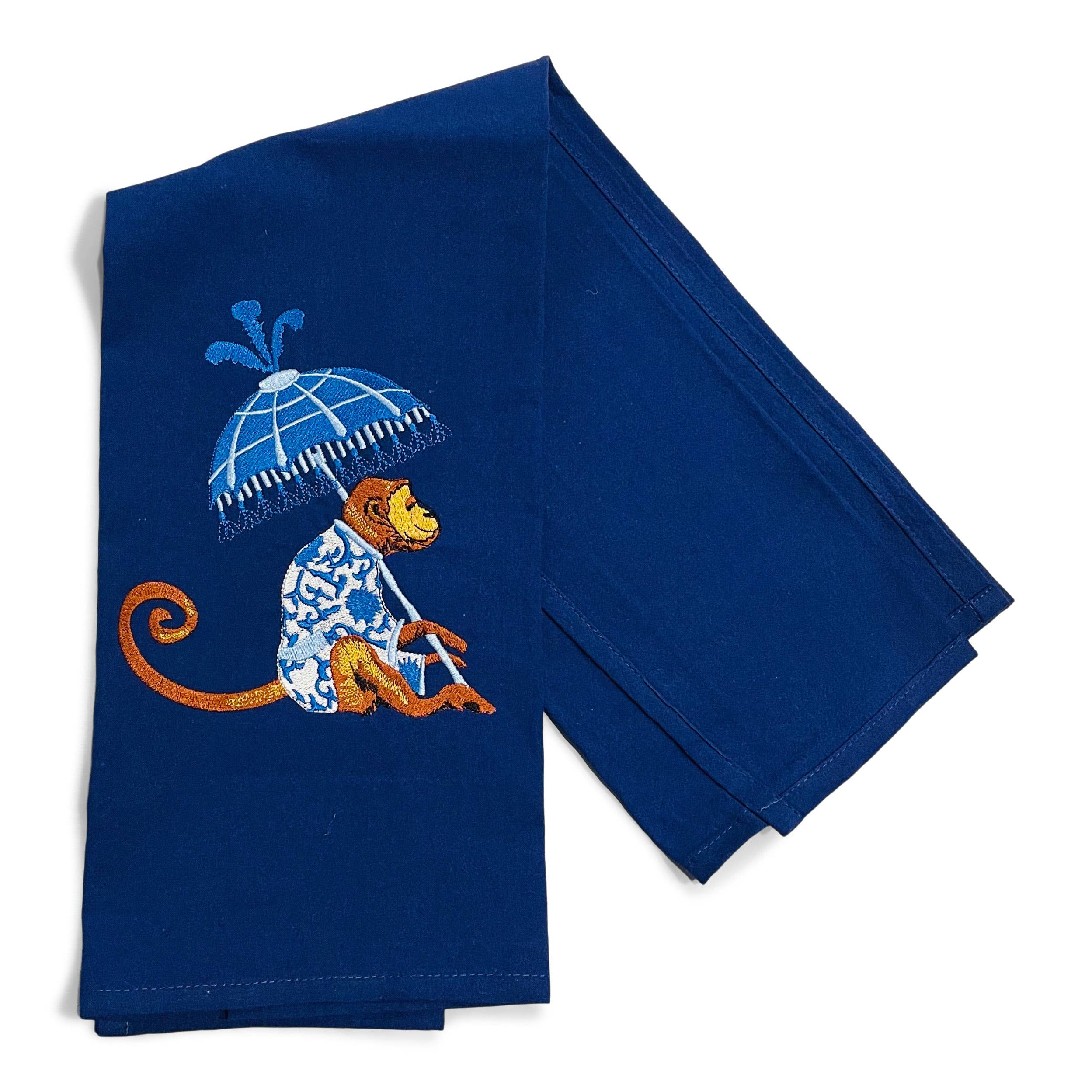 From our Chinoiserie collection - the Blue Monkey with Umbrella embroidered on a navy towel Size: 27.5" X 27.5" Flour sack dish towel option.