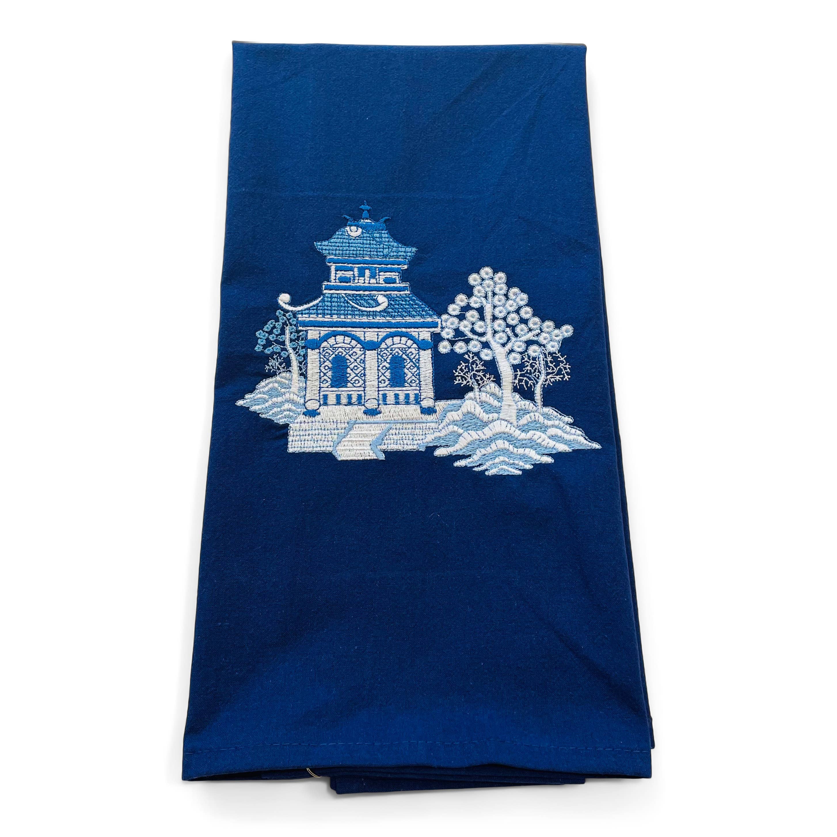 Choose this elegant chinoiserie design of a blue pagoda landscape on a navy towel. Size: 27.5" X 27.5" Flour sack dish towel option.